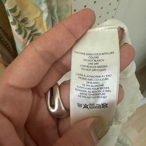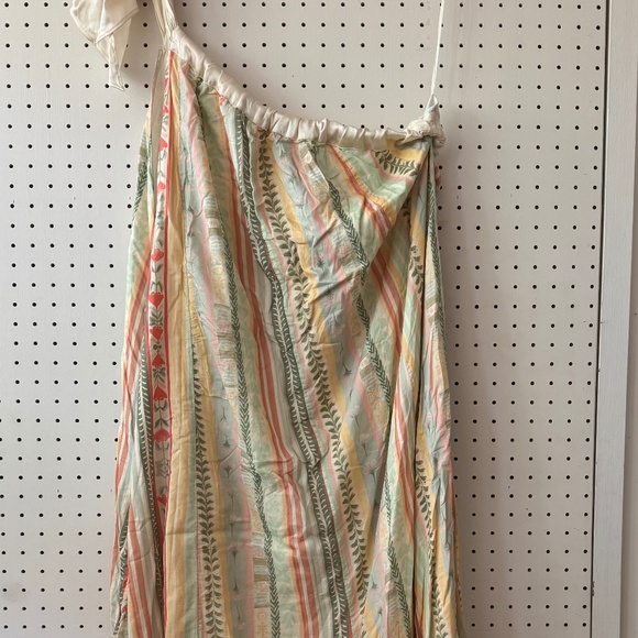 Free people size L one shoulder dress. Selling because it does not work with my body type. Super fun print and soft fabric. The design is quite flowy with pleated detailing along the bottom and also has pockets. The dress can fit a range of sizes.