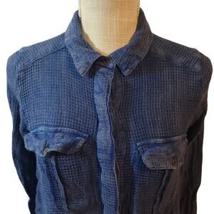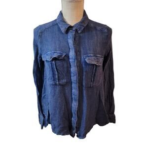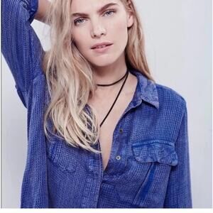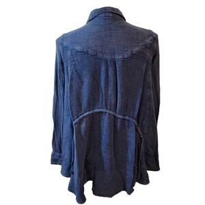 Free People "one of the guys" blue oversized waffle knit button down long sleeve shirt. Vintage, lived in look. Super soft material with buttons on cuffs and drawstring in the back to add shape. Hi-low style so length is longer in the back- perfect to wear with leggings! Could be worn open over a tank too! Good condition!