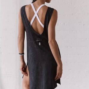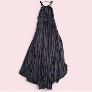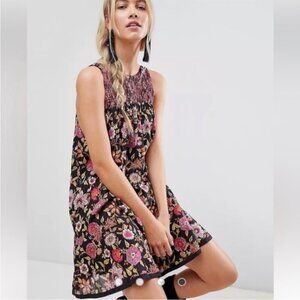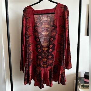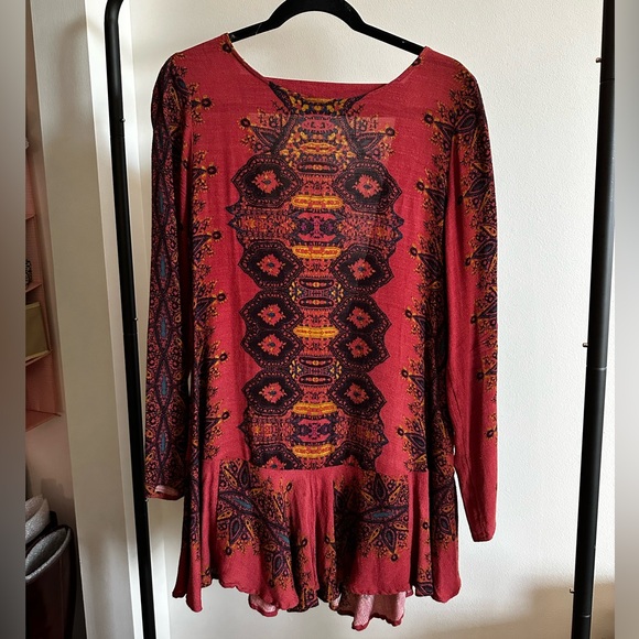 Free People bohemian backless dress in a rich rust color with accents of black, blue and mustard. Features long sleeves, an open back design, pockets (!) and a flared, flowy hem.