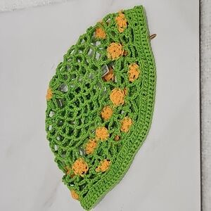 Free People Open Knit Crochet Skull Cap Beanie Hat Green w Orange Flowers