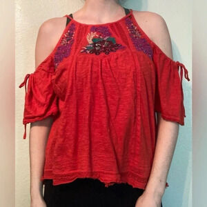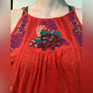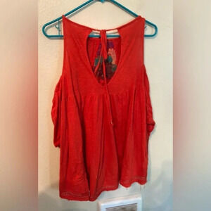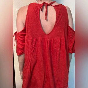 The most beautiful red tunic top! Shorter in front and longer in back. Good pre loved condition- some inconsistencies in fabric. One area is separating as shown in up close photo. Front bottom hem is a bit raw.