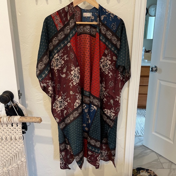 Patchwork print open tunic. Cute for the holidays over a dress or leggings. Oversized fit. XS