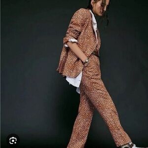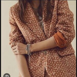 This Free People blazer in a burnt orange hue with a simple floral pattern offers a relaxed fit, perfect for adding a sophisticated touch to your ensemble. Its open front and full-length sleeves create a versatile piece that effortlessly complements any outfit. Ideal for both casual and formal occasions, this blazer is a must-have addition to your wardrobe.