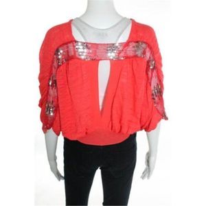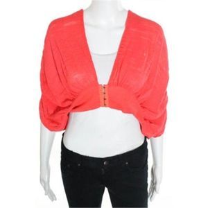 Free People Orange Coral Cotton Siler Sequined Trim VNeck Cropped Sweater Shrug