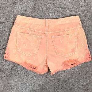 Factory distressing and Bleach splatter. Size 26. 15” waist laying flat, roughly 3.5” inseam, 9” rise.