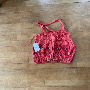 Crop top tank by Free People. Super fun summer piece! Soft red / orange tank top, crop style with elastic lining around the midsection, 1970s floral design, thick criss-cross straps, and comfy / loose material and fit. Brand new with tags!