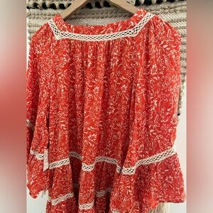 Vibrant orange blouse with floral pattern. Features lace detailing and flowy sleeves. Perfect for casual outings.