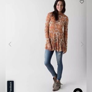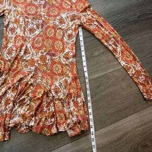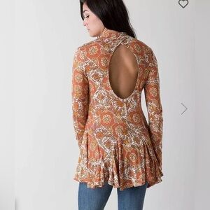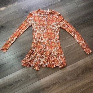 Free People Orange Floral Geometric Mock Neck Top Long Sleeve Tunic Size Small