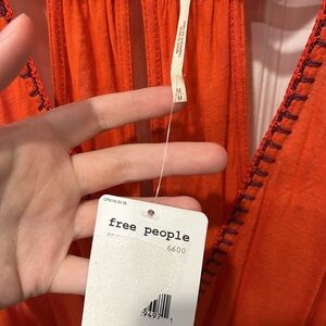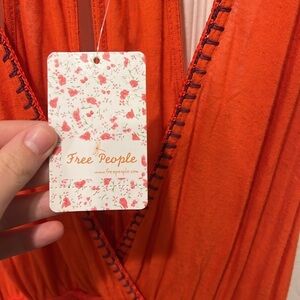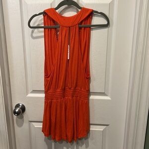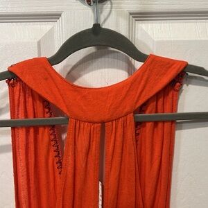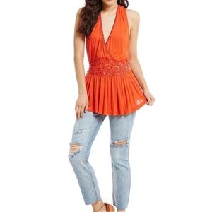 Vibrant orange sleeveless top. Features intricate lace detailing at the waist. Deep V-neck design.