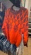 Bold orange sweater with intricate brown patterns. Cozy crew neck design. Perfect for a stylish look.