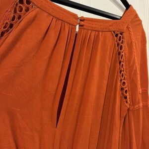 This vibrant orange romper from Free People features shirts with long sleeves. The flowy silhouette and soft fabric offer a comfortable fit, perfect for casual outings. Its warm, autumnal hue adds a touch of seasonal charm to your wardrobe.