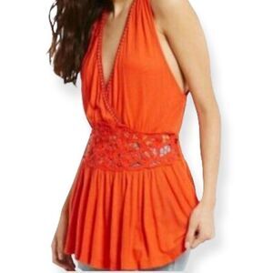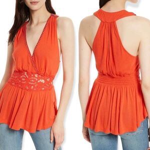 Free People Orange-Red Megan Embroidered Crochet Waist Peplum Tank Top in size Small