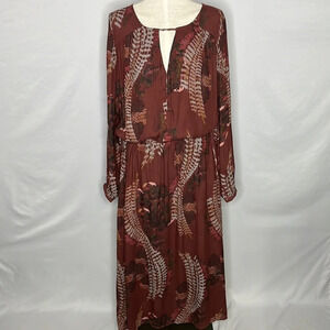 Free People Out of the Woods Maxi Dress in Scarlet Combo - Size Medium. Excellent pre-owned condition. Short lining to account for the side slits on the skirt section, adjustable drawstring waist with long ties on both sides, long sleeves with button cuffs, hook & eye closures at bust. Approximate measurements: 21" bust, 20" waist uncinched, 54" length. Deep scarlet red with gray print.