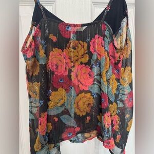 sheer cami featuring a bold floral print and shimmering metallic threads throughout. Lovely velvet accent at the V-neckline. Adjustable straps.