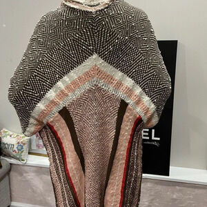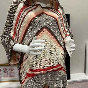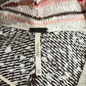 Brown, peach and cream Free People Oversized Aztec Cardigan poncho in very good condition . Little pulling in the bottom as showing in the pics but doesn’t take away anything from this Bohemian crochet embroidery look. Very unique casual wear piece.