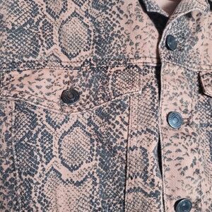 Free People Denim Snake Skin Print Jacket. Women's size XS. Oversized. Button up and has pockets and chest pockets and also inside pockets. In great preowned condition. Measurements are approximate and are shown in photos.