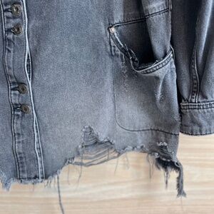 Black distressed denim jacket. Lightweight drapy relaxed fit oversized denim. Longer length.