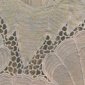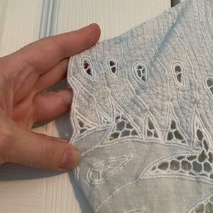 Pale blue seashell pattern with neon green stitching details. Short sleeve top with tie front. Longer in the back. One a few times, good condition.
