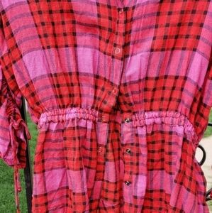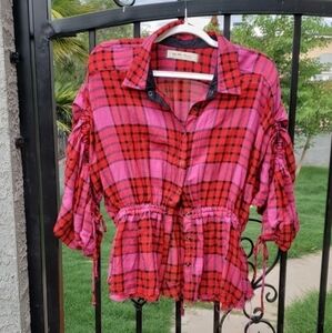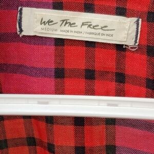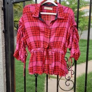 This lightweight button-down shirt from our We the Free collection features elastic ruching at the wait and sleeves for a super cool new way to wear plaid.