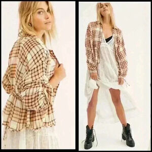 Free People Pacific Dawn Plaid Frayed Hem Western Rodeo Lagenlook Top Size XS