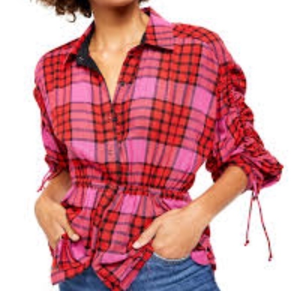 A cute cinched waist and classic plaid make this shirt a frilly, fun wardrobe staple. - Split collar - Long sleeves - Front button closure - Allover plaid print - Elastic waist - Tied cuff accent - Imported