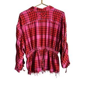 Free People Pacific Dawn Plaid Shirt Women's M Red Pink Wool Blend Long Sleeve
