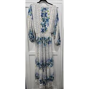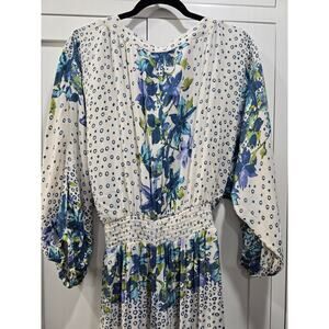 Breezy, boho, and beautifully detailed — this Free People Paradise jumpsuit features a flowing floral and dotted print in shades of blue and green on a white base. The tie-front bodice, wide-leg pants, and batwing sleeves create a flattering silhouette with a touch of vintage flair. Smocked back waistband and side pockets for added comfort and function.