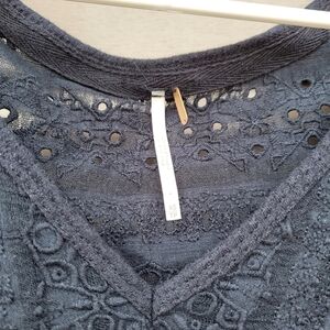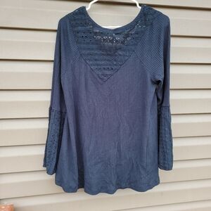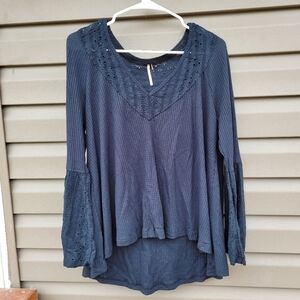 Women's size XS. Preowned in good condition. This waffle-textured top by Free People is a cozy staple elevated with bell sleeves for a feminine look.