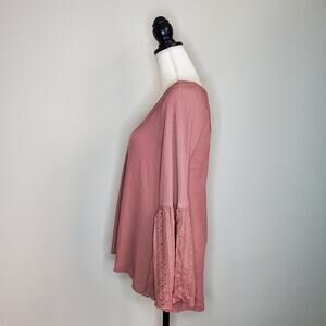 Soft, romantic, and perfect for fall layering. This rose pink Free People blouse features a boho-inspired waffle knit, eyelet-paneled yoke and sleeves, and flattering vented hem that adds easy movement. The long bell sleeves and V-neckline lend a feminine touch—ideal for pairing with jeans or skirts for that effortless, cozy-chic look.