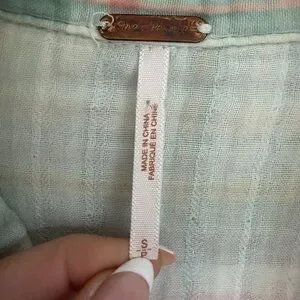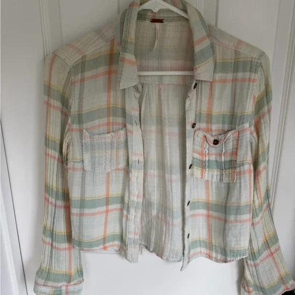 Lightweight button-up jean jacket with soft pastel plaid. Features chest patch pockets and long sleeves. Relaxed, slightly cropped fit for layering. Subtle mint, peach, and buttery tones.