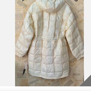The Features: Recycled PrimaLoft insulation, water and wind-resistant, hood with adjustable drawcords, side-slits with button closures, two-way zip closure, adjustable drawcords to cinch waist, front hand-pockets with button closure, packs up into interior pocket at back of jacket
