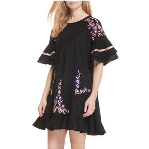 Pavlo Cotton Embroidered Dress is a babydoll-inspired dress with floral embroidery and ruffle details. The dress features a round neckline and elbow-length sleeves with double ruffles. It has a keyhole back with a button closure and is made of 100% cotton.