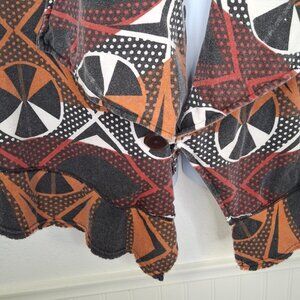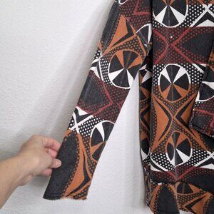 Pre-owned, good condition w/ repair. Normal signs of wash and wear including some minor fading and little pilling in a few spots. Vintage Free People. Novelty print peace sign graphic print in shades of dark orange, black, red and white. Button front. V-neckline w/ oversized collar. Oversized, relaxed fit. Long sleeves. Raw hem. Worn-in look. Size per tag: L (Large). Fabric: 100% Cotton. Size per tag does not guarantee desired fit, please see pictures for measurements.