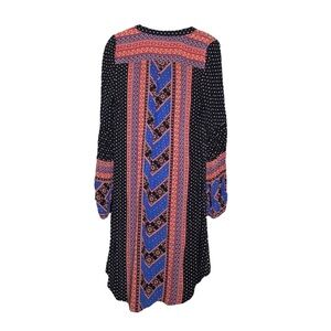 Fishtail-hem day dress featuring a bohemian multi-patterned print and peasant sleeves. Slit opening at front of neckline. Sleeve hems are stretchy. Hi-low hem. Oversized fit. Hook and eye closures that can be buttoned up or down Black with orange, pink, blue/purple, and cream boho pattern In very good condition Wear as tunic over jeans or leggings, or as a mini dress