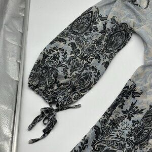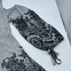This listing is for a pre-owned Free People Penny Lover gray chiffon cold shoulder mini dress in a size medium. This dress is in good used condition with no stains or rips, and features floral/paisley design, cold shoulder, sleeve and back ties, and side zipper closure. This dress was made in China and is made of 100% polyester with lining made of 100% rayon. Measurements are: front top of collar to bottom vertically is 34“, back top of collar to bottom vertically is 34“, top of collar to end of sleeve is 26“, chest (pit to pit) is 34“, waist is 32”, hips is 44“, and bottom hem of dress is 66“. Please see all listing photos, as this listing is for sale in as/is pre-owned condition.