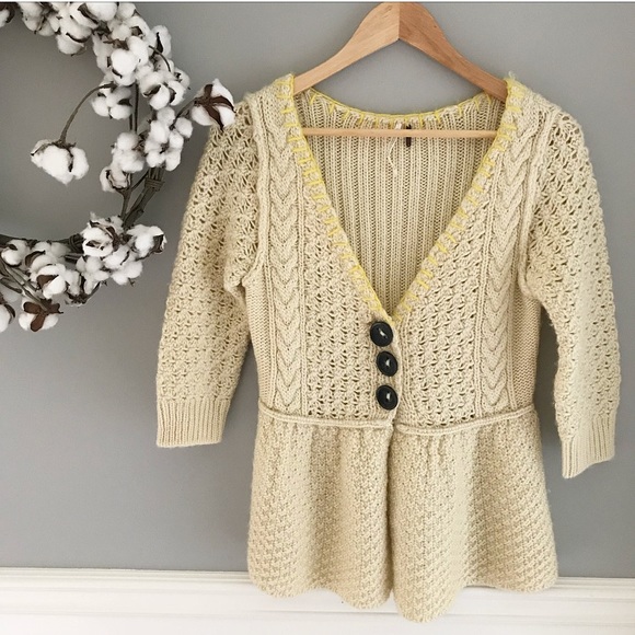 Free People Big Button Peplum Cardigan is grandma chic and perfectly sweet. Cream sweater with yellow accent stitching and 3 huge tortoise shell-ish buttons. Mixed stitching patterns elevate its style and the Peplum accentuates your waist. ▫️Bust: 36” when buttoned ▫️length: 26” ▫️60% wool 40% acrylic but not scratchy at all. Really soft. ▫️Size S ▫️sold at Free People stores ▪️Box E