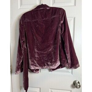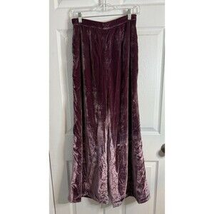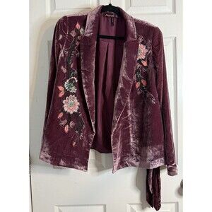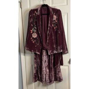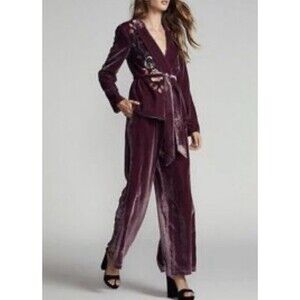 The Free People Perfect Illusion Velvet Embroidered Blazer Wide Leg Pants set in size 4 features a floral pattern on a plum-colored velvet fabric. The two-piece set includes a jacket with long sleeves and no button closure, paired with wide leg pants that are belted and lined with a rayon blend material. This bohemian-inspired pant suit is perfect for a variety of occasions and seasons, reflecting themes of festival, hippie, and retro styles. The set is designed by Free People and has an inseam of 29 inches, making it a stylish and comfortable choice for women looking for a statement outfit.