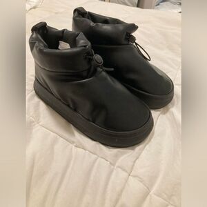 Features: Ankle length, faux leather uppers, round toe, puffer style, adjustable drawcord topline, pull tab, flatform rubber sole
