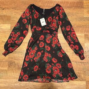 Free People Pin Up Style Red Rose & Polka Dot Long Sleeve V Neck Dress A13