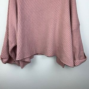 Free People I Can't Wait sweater in rose pink. A beautiful, slouchy oversized lightweight ribbed knit sweater made of a cotton blend. Raglan foldover sleeves, vents on sides, cropped to the natural waist with an unfinished hem for a casual bohemian vibe. Perfect for a slightly chilly summer night! Excellent used condition, women's size L large, measurements pictured.