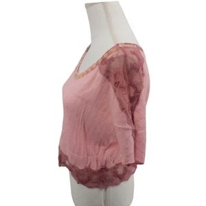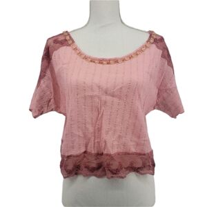 Free People Pink Laced Trimmed Crop Top Flowy with Gold Tinsel stripes Size Small Bead detailing along the neck line
