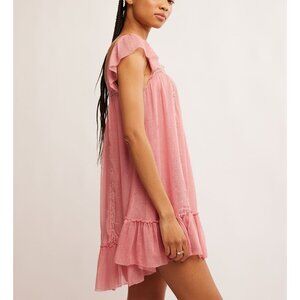 Chic pink mini dress. Features delicate lace details. Flowy and feminine design.