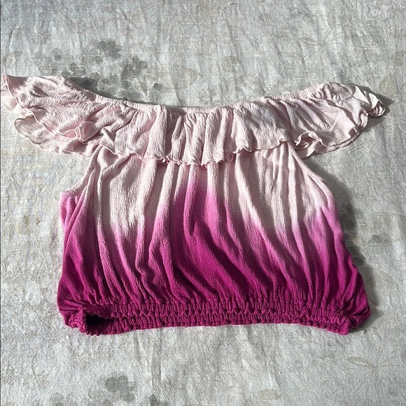 This stylish ombré top from Free People showcases a charming pink to magenta blend with ruffled and ruched details, offering a chic and feminine touch. The off-the-shoulder design and elasticized hem provide a flattering fit, making it perfect for warm weather outings. Its lightweight fabric ensures comfort and ease, ideal for a breezy day out.