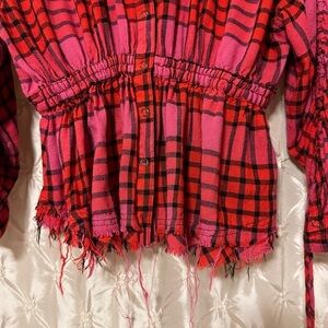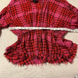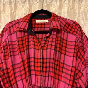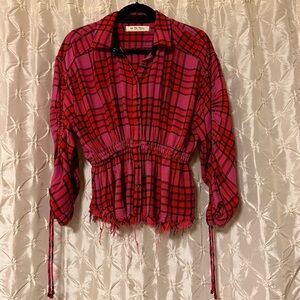 Free People Pink Red Combo Plaid Ruched Sleeve Pacific Dawn Blouse