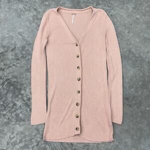 Free People Pink Ribbed Long Cardigan Sweater Medium Button Cashmere Silk Cotton