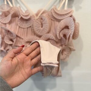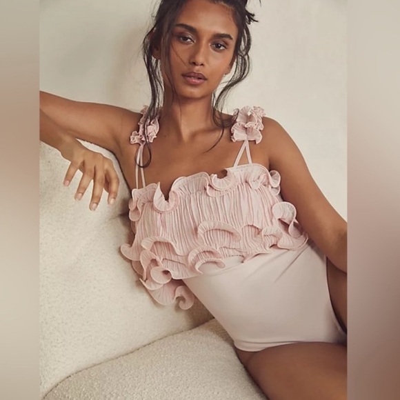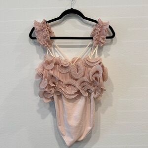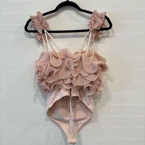 This elegant pink ruffled bodysuit offers a stylish and comfortable fit. Perfect for lounging or a night out, its delicate design adds a touch of sophistication to your wardrobe.