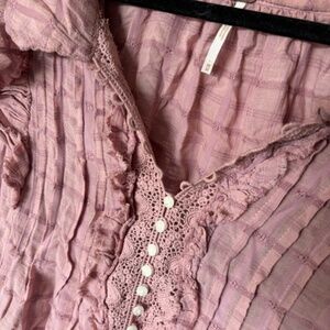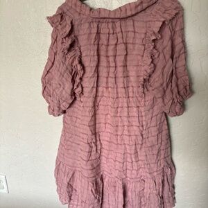 Chic mini dress with ruffled details. Features a deep V-neck and button accents. Perfect for casual outings.