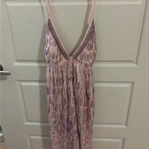 Elegant pink dress with shimmering sequins. V-neckline design. Perfect for special occasions.