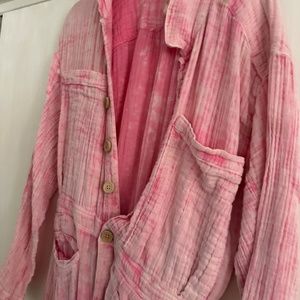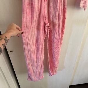 Chic pink jumpsuit with button-up front. Textured fabric adds style. Ideal for versatile wear.