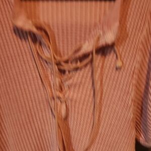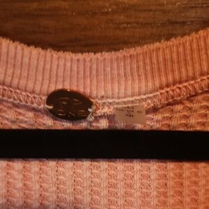 This Free People blouse showcases a charming pink and white color scheme, highlighted by its puff sleeves and a relaxed, ruffled design. The tie front and bib collar add a unique touch, making it a perfect choice for a casual yet stylish look.